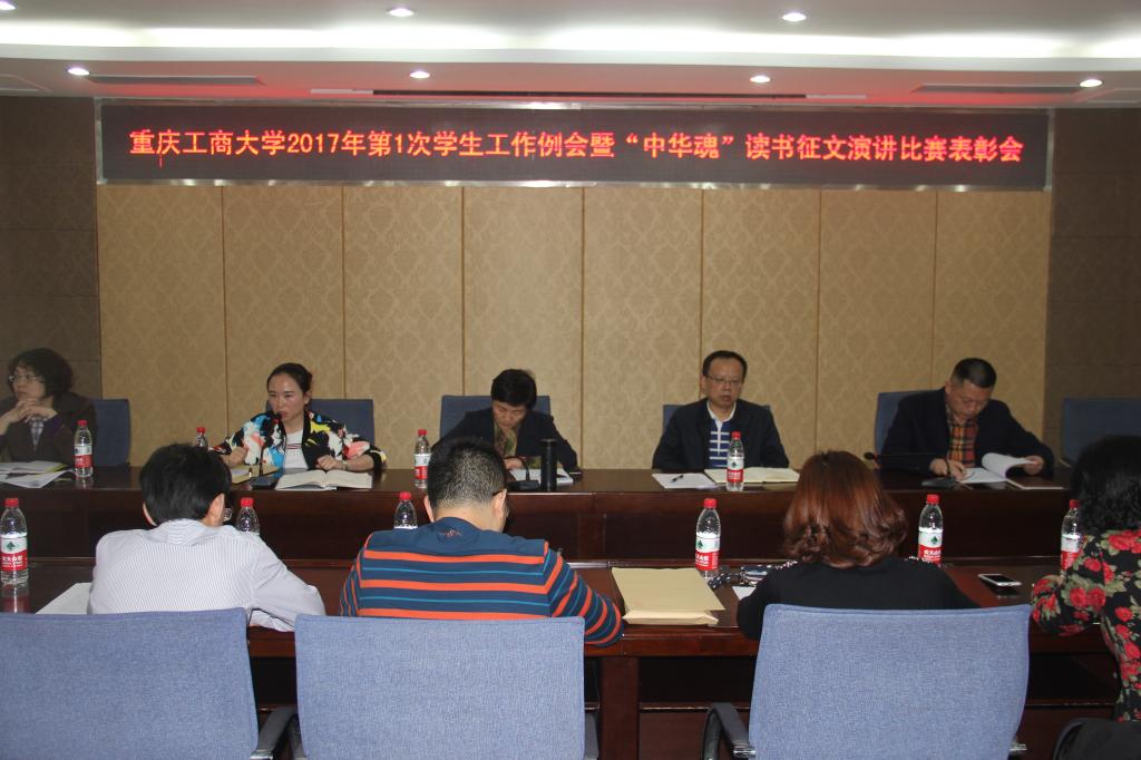 当前位置: 首页 >> 学工新闻 >> 正文 我校召开2017年第2次学生工作例会暨“中华魂”(遵纪守法,从我做起)读书征文演讲比赛表彰会 时间:2017年04月18日 09:44 作者: 4月17日下午,我校在厚德楼2017会议室召开2017年第2次学生工作例会暨“中华魂”(遵纪守法,从我做起)读书征文演讲比赛表彰会。 会议分两个阶段进行。第一阶段,学校关工委高古城副主任通报了“中华魂”(遵纪守法,从我做起)读书征文演讲比赛组织参赛情况,与会领导为优秀组织奖、优秀指导老师、优秀征文作者颁发了获奖证书。第二阶段,校团委副书记杨娟通报安排了近期共青团工作;学生处副处长石世明、李莉莎、刘代成分别就学业促进、考研寝室设立、发展性资助项目、征兵宣传动员等工作进行了布置。学校副校长郑旭煦最后就“教”与“学”互动、共同促进学校学风建设等问题进行了重点强调。 上一条:我校辅导员在重庆市第五届高校辅导员职业能力大赛中喜获佳绩 下一条:大连财经学院副校长王小巍一行来我校考察交流 【关闭】