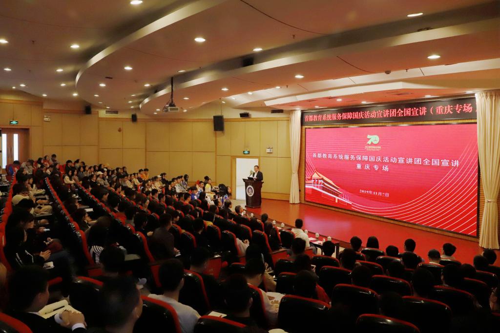 当前位置: 首页 >> 学工新闻 >> 正文 首都教育系统服务保障国庆活动宣讲团来我校宣讲 时间:2019年11月11日 11:07 作者: 文/钱洁、张羽飞 图/冉汀、缪雨珈 今年国庆节,首都教育系统组织了9.6万余名师生积极参与各项工作,为庆祝新中国成立70周年大会做出了贡献。教育部、北京市委签署嘉奖令,对参与国庆70周年活动服务保障工作的全体师生予以通报嘉奖,并遴选优秀师生代表组建了30个首都教育系统服务保障国庆活动宣讲团,奔赴全国高校开展宣讲。 11月7日下午,由中国地质大学(北京)、北方工业大学师生代表组成的首都教育系统服务保障国庆活动宣讲团走进我校,在博智楼7200报告厅开展集中宣讲活动。来自重庆邮电大学、重庆交通大学、太阳成tyc7111cc、重庆第二师范学院、重庆建筑工程职业学院的300余名师生代表参加了本次宣讲会。 我校陈运超副校长首先代表学校对宣讲团一行的到来表示最热烈的欢迎和最衷心的感谢。他高度赞扬了参与服务保障的首都师生的奉献精神和做出的贡献,希望全体师生学习传播国庆庆祝活动留下的宝贵精神财富,以首都师生为榜样,以更加优异的成绩为实现中华民族伟大复兴的中国梦奉献智慧和力量。 在接下来一个多小时的宣讲环节,宣讲团的江泠睿、吕慧敏、邢林慧子、付潼、祖力哈亚提·艾力、卢一狄6名老师和同学依次上台为现场师生分享他们在亲历国庆盛典现场那一刻的深切感受。 北方工业大学2018级本科生江泠睿,是群众游行“中华儿女”方阵第 9 中队队员。她以“必须完成任务”为题,讲述了她在父亲这名退伍老兵的影响下,毫不犹豫报名参加游行活动,并努力克服自己身体素质弱等困难,咬牙坚持训练,最终出色地完成了游行任务。 中国地质大学(北京)辅导员吕慧敏,担任群众游行“圆梦奥运”方阵第 12 中队中队长,她与队员们一路同行,开展思想政治教育、关注学生健康成长、带领队伍集散训练,保证队员始终如一的昂扬姿态,实现全队 0 缺勤。她形容参与此次活动就是一次“青春的记忆,生动的课堂”,她将不忘立德树人的初心和使命,持续推动爱国主义教育走深走实,让同学们在最好的年华里收获的不仅是激动一阵子的青春记忆,更是铭记一辈子的心灵成长。 中国地质大学(北京)2018级本科生邢林慧子,是群众游行“圆梦奥运”方阵第 2 中队小教员。她在宣讲中讲到,两个月的训练,她们看过升起的朝阳,挤过深夜的地铁,睡过凌晨的长安街,感受过正午的酷暑,也体验过寒风的刺骨,一切的付出,都是为了走过天安门的那一刻。虽然只是方阵中小小的一员,但亲眼见证着祖国军事力量的强大,亲身经历了两个月的训练到最后走上长安街接受全国人民的检阅,一切付出都值得! 北方工业大学2017级本科生付潼,是一名彩车展览展示志愿者。他们虽然没有在国庆当天出现在天安门广场,没有护送这些彩车走过长安街,但在展览展示期间,彩车志愿者连续 8 天,累计志愿时长 7800 余小时,从日出到日落,在诺大的展览场地,他们已然成为 34 辆主题彩车的守护者。 北方工业大学2017级本科生祖力哈亚提·艾力,是群众联欢“健康中国”板块中的一员,她作为一名来自南疆边陲的维吾尔族学生,不仅自己带病坚持参与联欢活动训练,还带动身边同学认真训练、毫不懈怠,在国庆当天向祖国和人民完美展示。她动情地说,参加此次活动让她更加深刻地体会到,每一个人的小生活、小努力和小坚持,都与中华民族伟大复兴的大历史是那样地紧密相连;更加明白习近平总书记所说的“各个民族要像石榴籽那样紧紧抱在一起”这句话的真正含义;更加深刻理解只有把小我融入到大我中,中华民族这棵大树才能枝繁叶茂。 中国地质大学(北京)2018级本科生卢一狄,是群众游行“圆梦奥运”方阵第 12 中队队员。作为家族中第三代参与国庆群众游行活动的他,在前期训练中全情投入,积极训练,在十月一日当天带着自豪感和使命感走过天安门广场,开启为国奉献的新征程。 市委教育工委、市教委宣教处处长吴边主持宣讲会并讲话。他对宣讲团成员致以诚挚的敬意和衷心的感谢。他号召新时代青年将小我融入大我,昂扬向上,奋发有为,矢志为中华民族的伟大复兴而努力奋斗,争做中国特色社会主义事业的合格建设者和可靠接班人。他希望全体师生深入学习首都师生集中展示的爱国主义精神、责任担当精神和不畏艰难精神,铸牢爱国之情,立好强国之志,践履报国之行;希望全体师生要坚持以习近平新时代中国特色社会主义思想为指导,深入学习和贯彻习近平总书记国庆系列重要讲话精神,“不忘初心,牢记使命”,进一步增强“四个意识”、坚定“四个自信”、做到“两个维护”,切实把庆祝活动形成的宝贵精神财富更好转化为立德树人、教育报国的实际行动,努力培养担当民族复兴大任的时代新人,共同为实现“两个一百年”奋斗目标和中华民族伟大复兴的中国梦而不懈奋斗。 会计学院辅导员王婷老师表示,聆听完宣讲团师生与家国情怀的同频共振的故事,被他们炽热浓烈的“中国心”“中国情”深深打动。青年一代的理想信念、精神状态、综合素质,是一个国家发展活力的重要体现,也是一个国家核心竞争力的重要因素。他们让我看到千千万万矗立时代潮头的青年学生们,将青春梦融入中国梦,让青春因为奉献而厚重因为奋斗而精彩。2019级经济与