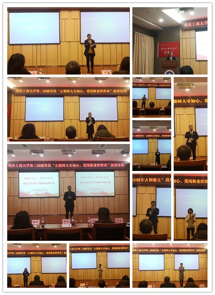 当前位置: 首页 >> 学工新闻 >> 正文 我校成功举办第三届辅导员“立德树人”演讲比赛 时间:2020年01月10日 14:42 作者: 为切实落实立德树人根本任务,进一步提升辅导员职业能力,充分发挥辅导员在大学生日常思想政治教育中的作用,由校党委学工部主办、辅导员素质能力提升训练营承办的第三届辅导员“立德树人守初心,爱岗敬业担使命”演讲比赛于1月6日下午在南岸校区图书馆第一会议室举行。来自18个学院的28名辅导员参加了比赛。比赛由艺术学院辅导员姚建玉主持。 在第一阶段主题演讲环节中,参赛选手结合工作实际讲述了自己对于“立德树人守初心,爱岗敬业担使命”的深刻感悟。根据比赛规则,第一阶段排名前10的选手进入第二阶段即兴理论宣讲环节。经过激烈的角逐,机械学院邢月军、财金学院兰丽娟荣获一等奖,外语学院丁亮、数统学院余思云、机械学院周利民荣获二等奖,环资学院王洪成、经济学院邓雪霜、计信学院向巧、法学院何祖润、计信学院李菁荣获三等奖。 副校长陈运超出席了本次比赛并作总结讲话,他对参赛选手的着装细节、演讲表现形式以及选手们演讲的核心内容进行了点评,希望选手们注重比赛细节,准确把握“演讲”的表达形式,同时希望广大辅导员不忘初心,不嫌其繁地坚守、不嫌其繁地创新,在辅导员岗位上干出成绩。 此次演讲比赛是我校辅导员立德树人的自信表达,也是对学生工作新年新气象的美好展望。 上一条:学校举行2020年寒假留校学生新春团拜会 下一条:【辅导员训练营第四期】 公文写作小组第二次活动顺利开展 【关闭】