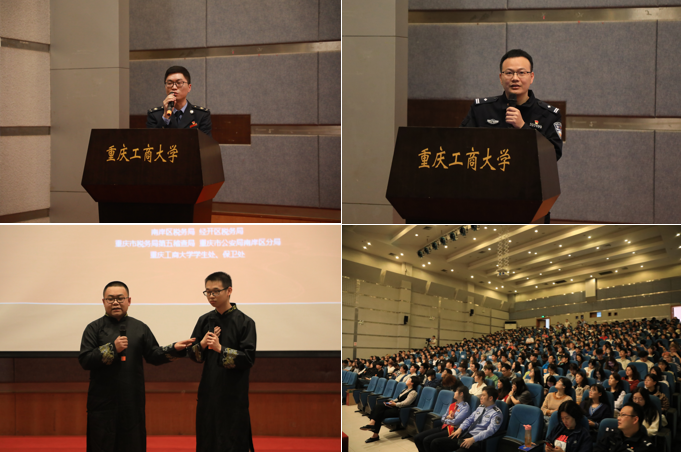 当前位置: 首页 >> 学工新闻 >> 正文 学校联合税务、公安机关举办“保护个人信息 提高反诈意识”普法宣传活动 时间:2021年04月28日 11:11 作者: 文/毛彬、图/金梦迪、陈婉琳、刘诗睿 为预防大学生个人信息被冒用,提高大学生反诈防骗意识,学校党委学工部(学生处)、党委保卫部(保卫处)联合南岸区税务局、经开区税务局、重庆市税务局第五稽查局、南岸区公安分局,于4月27日共同举办了“保护个人信息,提高反诈意识”普法宣传活动。 在博智楼7100的宣讲现场,市税务局第五稽查局的陈彦好通过短片向学生展示了保护个人有效证件的重要性,并用案例分析个人信息泄露后可能产生的后果和法律风险,个人“被入职”“被工资”等可能会出现的问题,以及遇到以上情况的处理方式。南岸区公安分局四公里派出所民警刘国魁则就常见的通讯网络诈骗手段与防范措施为学生们进行了讲解,用活生生的案例描述了当前大学校园中极易出现的“杀猪盘”、刷单返利、冒充电商客服等诈骗手段,向现场同学进行警示教育。来自机械工程学院的学生李杨林、罗宇还用他们自编自导的相声节目,生动演绎了当前网络诈骗常见套路,让同学们在欢声笑语中学习反诈防骗知识。 宣讲活动前,来自税务、公安机关的青年志愿者们还在博智楼前向学校师生发放了宣传手册上千份。 该活动也是学校近期开展“反诈防骗,你我同行”主题宣传教育活动之一。学校党委学工部副部长陈亚惠表示,学校非常重视学生身份信息安全、预防诈骗等工作,这次邀请税务、公安机关到学校进行普法宣传,很有针对性,非常实用,希望借此加强对学生和老师们的宣传教育,以遏制电信网络诈骗高发态势,营造安全稳定的校园环境,不断提升师生获得感、幸福感、安全感。 上一条:我校举办2021届优秀毕业生事迹宣讲报告会 下一条:学校开展防范电信网络诈骗主题宣传教育活动 【关闭】