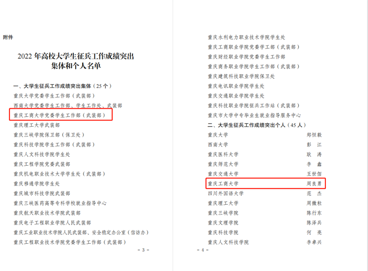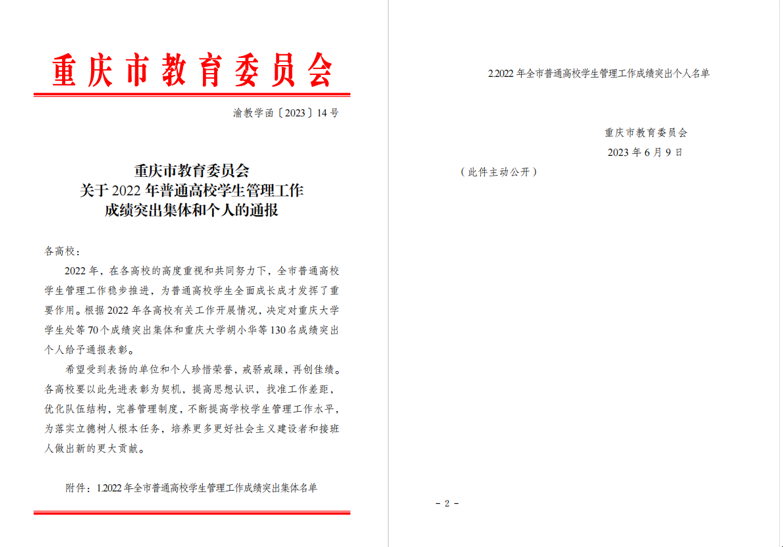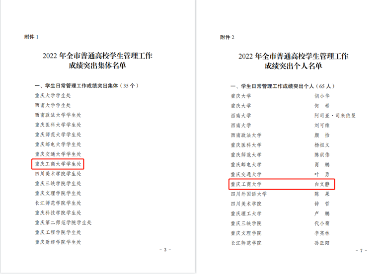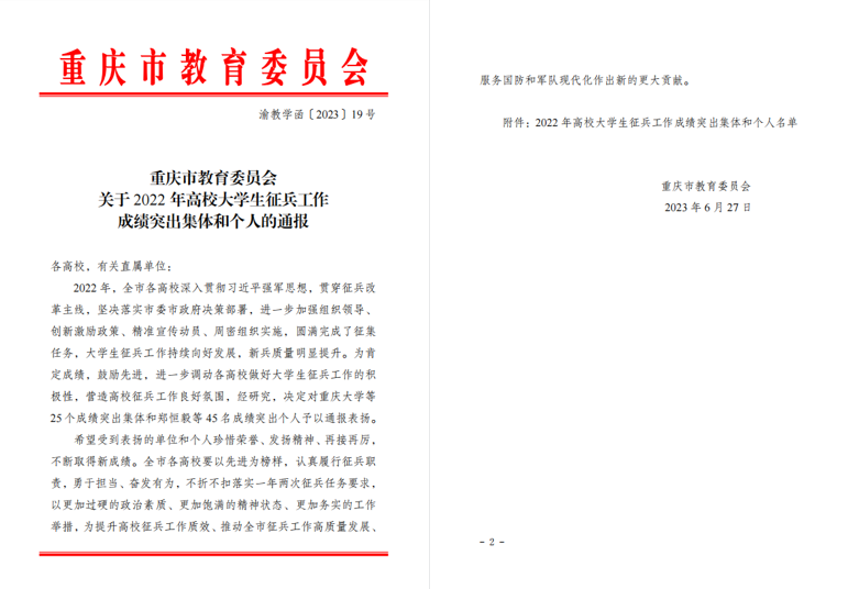 当前位置: 首页 >> 队伍建设 >> 辅导员风采 >> 正文 我校学生日常管理工作、征兵工作成绩突出获市教委通报表彰 时间:2023年07月05日 16:36 作者: 近日,重庆市教育委员会发布《关于2022年普通高校学生管理工作成绩突出集体和个人的通报》(渝教学函〔2023〕14号)和《关于2022年高校大学生征兵工作成绩突出集体和个人的通报》(渝教学函〔2023〕19号)。我校学生处获评“学生日常管理工作成绩突出集体”,白文静同志获评“学生日常管理工作成绩突出个人”;党委学工部(武装部)获评“大学生征兵工作成绩突出集体”,周良勇同志获评“大学生征兵工作成绩突出个人”。 上一条:秦杉老师获第二届川渝青年教师风采大赛高校组二等奖 下一条:王婷同志入选2023年重庆市高校辅导员名师工作室 【关闭】