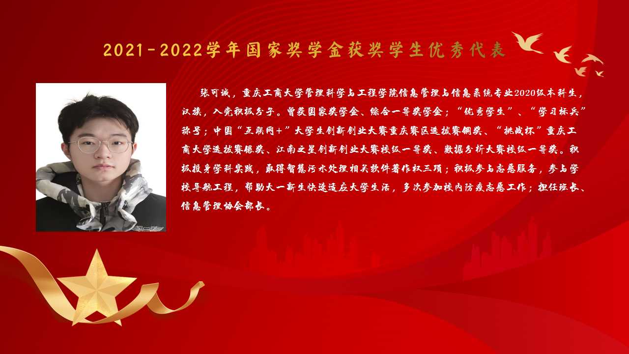 当前位置: 首页 >> 学生资助 >> 国家奖助学金 >> 正文 2021-2022学年国家奖学金获奖学生代表展示 时间:2023年01月11日 09:24 作者: 上一条:关于开展2024年国家奖学金评审工作的通知 下一条:关于2021年度国家励志奖学金、国家助学金获奖学生初审名单公示的通知 【关闭】