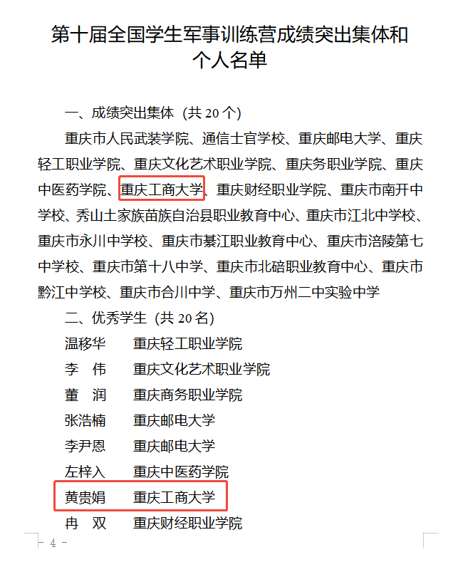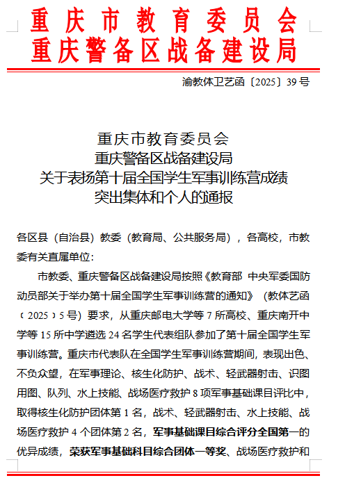 当前位置: 首页 >> 国防教育 >> 国防教育网 >> 正文 我校荣获第十届全国学生军事训练营 “成绩突出集体” 称号,黄贵娟同学获评 “优秀学生” 时间:2025年09月23日 17:48 作者: 周良勇 近日,重庆市教育委员会、重庆警备区战备建设局联合印发《关于表扬第十届全国学生军事训练营成绩突出集体和个人的通报》(渝教体卫艺函〔2025〕39 号),我校被授予 “成绩突出集体” 荣誉称号,体育学院学生黄贵娟获评 “优秀学生”。 第十届全国学生军事训练营由教育部、中央军委国防动员部联合举办,重庆市教委、重庆警备区战备建设局从全市多所高校、中学遴选优秀代表组建重庆代表队参赛。在军事理论、核生化防护、战术、轻武器射击、识图用图、队列、水上技能、战场医疗救护 8 项军事基础课目评比中,重庆代表队斩获核生化防护团体第 1 名,战术、轻武器射击、水上技能、战场医疗救护 4 个团体第 2 名,以军事基础课目综合评分全国第一的佳绩,荣获军事基础科目综合团体一等奖等多项荣誉。 作为重庆代表队的重要参与单位之一,我校高度重视学生国防教育与军事训练工作,始终将国防教育融入立德树人全过程。在训练营备赛与参赛期间,学校精心选拔参训学生,围绕军事技能、理论知识等核心内容开展系统性培训,助力学生夯实军事基础、提升综合素养。黄贵娟同学在训练与竞赛中始终以高标准严格要求自己,刻苦钻研军事理论,勤加练习军事技能,以坚韧的意志品质和出色的表现,充分展现了我校学子崇军尚武、奋勇拼搏的精神风貌。 上一条:学校隆重举行庆祝中华人民共和国成立76周年升国旗仪式 下一条:太阳成tyc7111cc举行2024-2025学年优秀退伍学生表彰暨国防教育协会国旗护卫队换届表彰大会 【关闭】