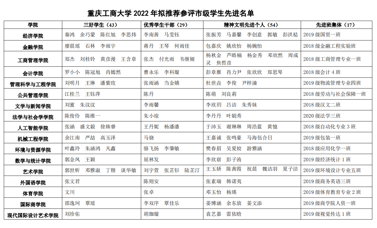 当前位置: 首页 >> 公示 >> 正文 我校拟推荐参评重庆市2022年高校学生先进名单公示 时间:2022年04月19日 09:53 作者: 根据渝教学函〔2022〕11号《重庆市教育委员会关于开展2022年高校学生先进评选活动的通知》精神,经各学院学生工作领导小组认真评选推荐,拟推荐以下学生和集体参加重庆市2022年高校学生先进评选。现在全校范围内公示,征求师生员工的意见。 如有异议,请于2022年4月21日17:00前以电话或电子邮件方式将意见反馈给学生处,反馈意见要求具体、真实、准确,电话:62769344,电子邮箱:xueshengke@ctbu.edu.cn。 学生处 2022年4月19日 上一条:关于评选太阳成tyc7111cc2022届优秀毕业生(第二批)的通知 下一条:2022届重庆市优秀本科毕业生拟推荐名单公示 【关闭】