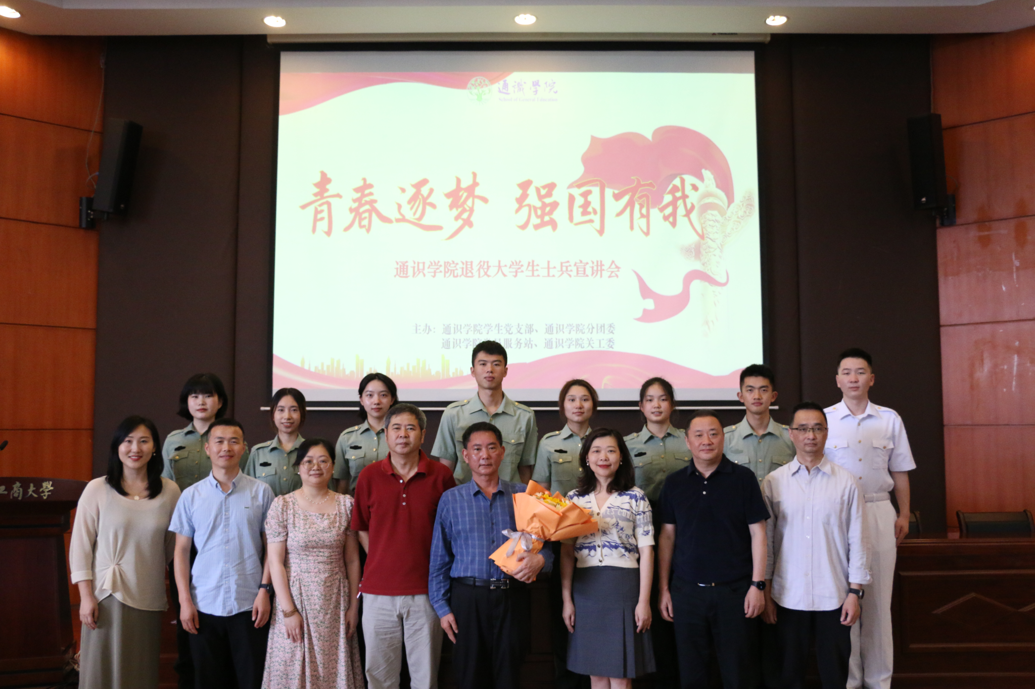 当前位置: 首页 >> 社区建设 >> 正文 通识学院举办“青春逐梦,强国有我”退役大学生士兵宣讲会 时间:2024年05月13日 11:59 作者: 通识学院 5月10日下午,由通识学院关工委、分团委、学生党支部、党员服务站举办的“青春逐梦,强国有我”退役大学生士兵宣讲会在江北校区B509学术报告厅举行。学校校友会副会长、通识学院关工委副主任何军,通识学院党总支副书记、副院长况源,江北校区管委会副主任赵雄、通识学院专职组织员宫彪、校党委武装部国防教育科科长周良勇,退休教师刘照禄出席本次活动。通识学院辅导员代表和2023级全体入党积极分子参会,其他同学通过线上直播观看宣讲会。 会上,五名退役大学生分享了他们的军旅故事。23金融二班的曹海燕用坚韧书写青春华章,完成了她从懵懂学生到侦察尖兵的华丽转变;荣获“四有”优秀士兵称号的23数学班石佳俊,在孤寂的哨岗上坚守1000多个小时,默默守护着祖国的边疆;23财政一班的孙震钢,在日常战备训练中英勇无畏,突破自身极限,用行动守卫祖国浩渺海疆;开放在祖国边疆的绿色军“花”——23财会四班的叶乙蓓,她用实际行动在中印边境诠释了什么是“巾帼不让须眉”;23城规二班林家銮坚持训练,不断磨砺意志,超越自我,让青春梦想在雪域高原上绽放。随后,刘照禄老师讲述了自己的老兵经历。 宣讲会现场气氛热烈,掌声不断。现场同学纷纷表示,听完退役大学生和老兵的故事,被他们勇当先锋、励志前行、永葆军人本色的精神深深感动,要以优秀军人为榜样,攻坚克难,不负韶华,用自己的实际行动为中华民族伟大复兴的光辉事业作出贡献。 宣讲会上,通识学院发布了《通识学院“一站式”社区示范寝室创建规范》,通过创建退役大学生士兵示范寝室、入党积极分子示范寝室和学习优秀示范寝室,强化学生的自我管理意识,发挥优秀学生的示范带头作用,更好地发挥“一站式”社区的育人作用。会后,学院领导、辅导员代表到学生社区为示范寝室挂牌。 上一条:环境与资源学院举办“一站式”学生社区之“缤纷夏日,寓见绿荫”环保家年华活动 下一条:人工智能学院楼管会、社区党支部携手关工委深入学生社区开展“共抒强国志,共筑清廉心”主题活动 【关闭】