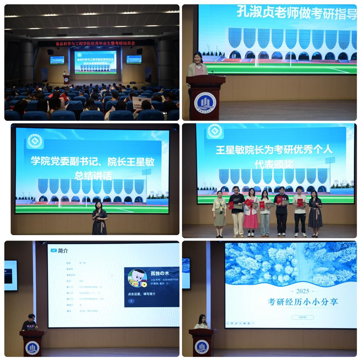 当前位置: 首页 >> 社区建设 >> 正文 智汇研途,聚力赋能——食品科学与工程学院举办优秀毕业生宣讲会暨考研动员会 时间:2025年05月29日 16:47 作者: 食品科学与工程学院 食品科学与工程学院以“一站式”学生社区建设为契机,启动“智汇研途”考研辅导赋能计划,活动整合教学、学工、专业教师等多方资源,2025年5月28日晚在明智楼110100报告厅举办优秀毕业生宣讲会暨考研动员会。食品科学与工程学院于学院院长王星敏、各系主任、学工办全体辅导员、2022级、2023级全体学生及2021级优秀毕业生代表共同参与。党委副书记、纪委书记张薇薇主持会议。 活动伊始,张薇薇副书记通过详实数据分析了近年考研形势,对学院2025年考研工作做了全面总结,向同学们强调科学备考的重要性。制药工程系孔淑贞老师从专业角度解读考研政策,提出“为何考研”“如何考研”“三轮复习法”等备考策略。会上对10余名考研优秀学子进行了表彰,以榜样力量激励全场。 在经验分享环节,2021级4名优秀毕业生代表从备考规划、院校选择、复试技巧等多个维度展开讲述。考取中国海洋大学研究生的李广昊特别分享了考研英语复习攻略;考取江南大学的张江林、暨南大学的张姜、西南大学的何婷婷同学分享了“错题本+思维导图+学习笔记”等双轨学习法,引发热烈反响。互动环节中,低年级学生围绕跨专业考研、科研经历积累等问题与学长展开深度交流。 活动最后,王星敏作总结讲话,她以“三个考研福袋”“三句话”“三个叮咛”强调考研深造对个人发展和学科建设的重要意义,鼓励学生“既要仰望星空立大志,也要脚踏实地下苦功”,她强调新时代食品人才要立足国家大健康战略,在食品安全、营养健康、智能加工等领域深耕突破。 本次动员会是学院深化“一站式”学生社区建设、推动育人力量下沉的生动实践。通过精心设计的“形势分析+政策指导+榜样引领+院长思政课”四维赋能模式,不仅有效点燃了学子们的求知热情和考研斗志,更将专业教育的时代内涵与价值引领有机融入学生日常学习生活的社区场景。与会学生深受鼓舞,纷纷表示要将考研深造作为人生进阶的新起点,以过硬本领服务健康中国建设和乡村振兴战略,让青春在实现食品科技自立自强的赛道上绽放绚丽之花。学院将持续在“一站式”社区内跟进考研学子的需求,提供全过程、全方位的指导与支持服务。 上一条:会计学院楼管会举办“艾香传古韵,粽情绘新章”端午非遗体验活动 下一条:“职在一站式社区”——食品科学与工程学院举办2025届毕业生专场招聘会助力学子就业百日冲刺 【关闭】