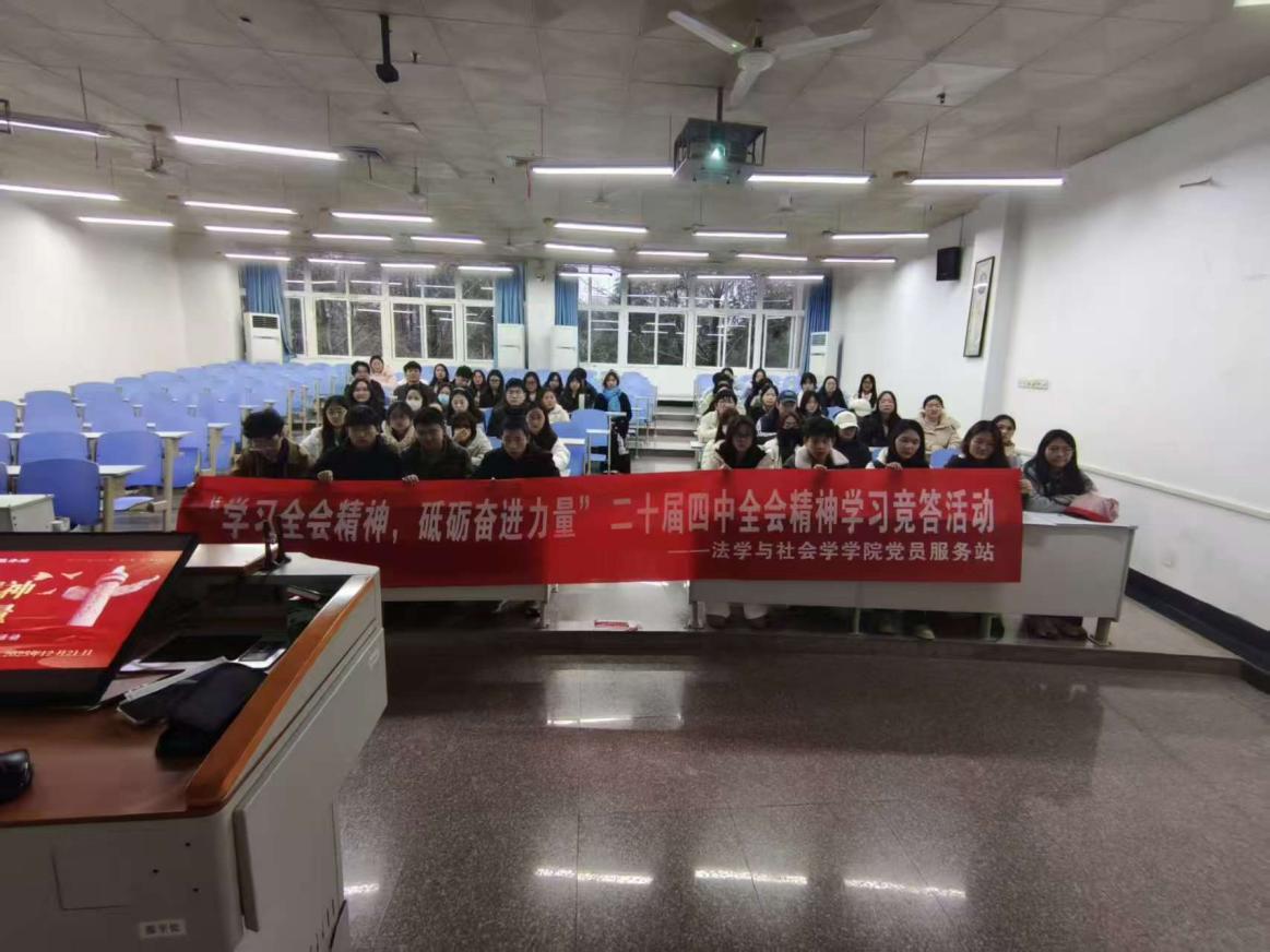 当前位置: 首页 >> 社区建设 >> 正文 法学与社会学学院举办党的二十届四中全会精神学习竞答活动 时间:2025年12月22日 16:23 作者: 法学与社会学学院党员服务站 为深入学习贯彻党的二十届四中全会精神,引导广大同学准确把握“十五五”规划建议的战略部署,太阳成tyc7111cc法学与社会学学院党员服务站于12月21日在南岸校区慧智楼90208教室举办“学习全会精神,砥砺奋进力量”——党的二十届四中全会精神学习竞答活动。 本次活动中,同学们认真观看了三段关于二十届四中全会精神与“十五五”规划战略部署的专题学习视频。在随后的竞答环节,各小组积极参与,围绕客观题与主观题展开思考并踊跃回答。现场气氛专注而热烈,问答互动有效检验和巩固了同学们对前一阶段学习要义的理解,起到了强化理论武装、凝聚思想共识的积极作用。活动尾声,工作人员收集了活动意见反馈便利贴,并完成了各组成绩的统计。 本次活动通过集体学习与竞答的形式,提升了同学们的理论素养,凝聚了思想共识。未来,法学与社会学学院党员服务站将持续开展形式多样的理论学习与实践活动,引导广大同学将学习成果内化于心、外化于行,不断提升政治素养与综合能力,更好地发挥党员服务站的示范引领作用。 上一条:机械工程学院:凝聚“四维”育人合力 打造“一站式”学生社区育人新场域 下一条:红色记忆映八秩 烽火故事颂英魂——会计学院红岩党员服务站举办抗日故事宣讲活动 【关闭】