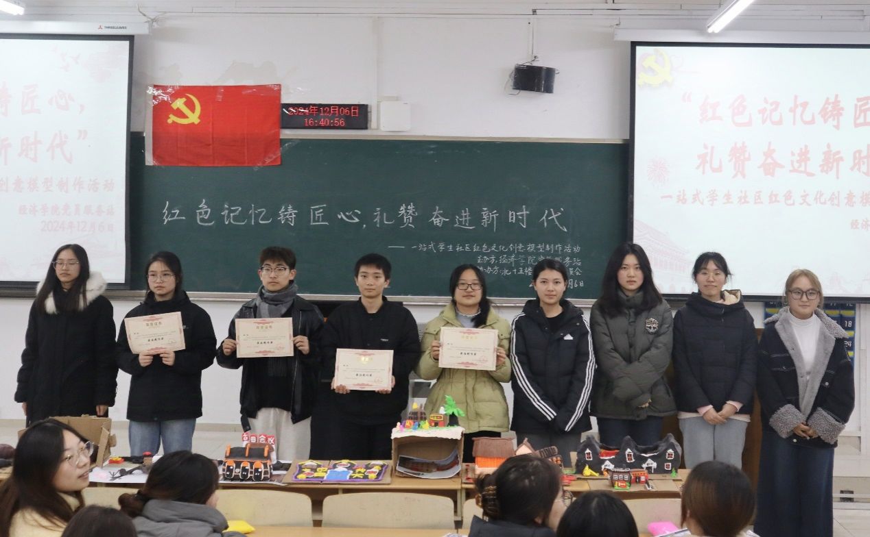 当前位置: 首页 >> 社区建设 >> 楼栋管理委员会 >> 正文 经济学院北15楼管会开展”一站式”学生社区红色文化创意模型制作活动 时间:2024年12月09日 16:28 作者: 经济学院北15楼管会 为弘扬红色文化,增强青年学生的历史使命感和爱国情怀,经济学院北15楼管会联合经济学院党员服务站于2024年12月6日在博智楼07208教室举办“红色记忆铸匠心,礼赞奋进新时代”——“一站式”学生社区红色文化创意模型制作活动,活动由23级财政一班田梦婷同学主持,共70余名同学参与。 在制作过程中,同学们充分发挥创意与动手能力,积极查阅相关资料,交流讨论,深入挖掘红色文化内涵,将对红色历史的理解与对革命先烈的敬意融入作品之中。经过50分钟的创作,一件件精美的模型作品在同学们的手中诞生,这些作品不仅展现了同学们精湛的手工技艺,更体现了他们对红色文化的深刻理解与思考。 制作完成后,各小组依次上台展示。同学们都纷纷表示制作时仿佛穿越时空,身临其境地感受到革命时期先辈奋斗的艰苦环境,真切地体会到今天幸福生活的来之不易,更加坚定了在新时代奋进前行的决心。经过投票,第七组、第九组、第十组和第十一组获奖,由北15楼长邓怡静同学为获奖小组颁奖。 本次活动将红色教育与实践创新相结合,有效激发了同学们的爱国情怀与民族自豪感,进一步推动了校园红色文化建设,同学们表示将会继续传承红色精神,热爱伟大祖国,为实现中华民族伟大复兴而不懈努力. 上一条:乐迎冬至 情暖人间—会计学院北22楼管会开展冬至文化体验活动 下一条:冬季安全不放松,师生同行护平安——法学与社会学学院开展学生公寓冬季安全大检查活动 【关闭】