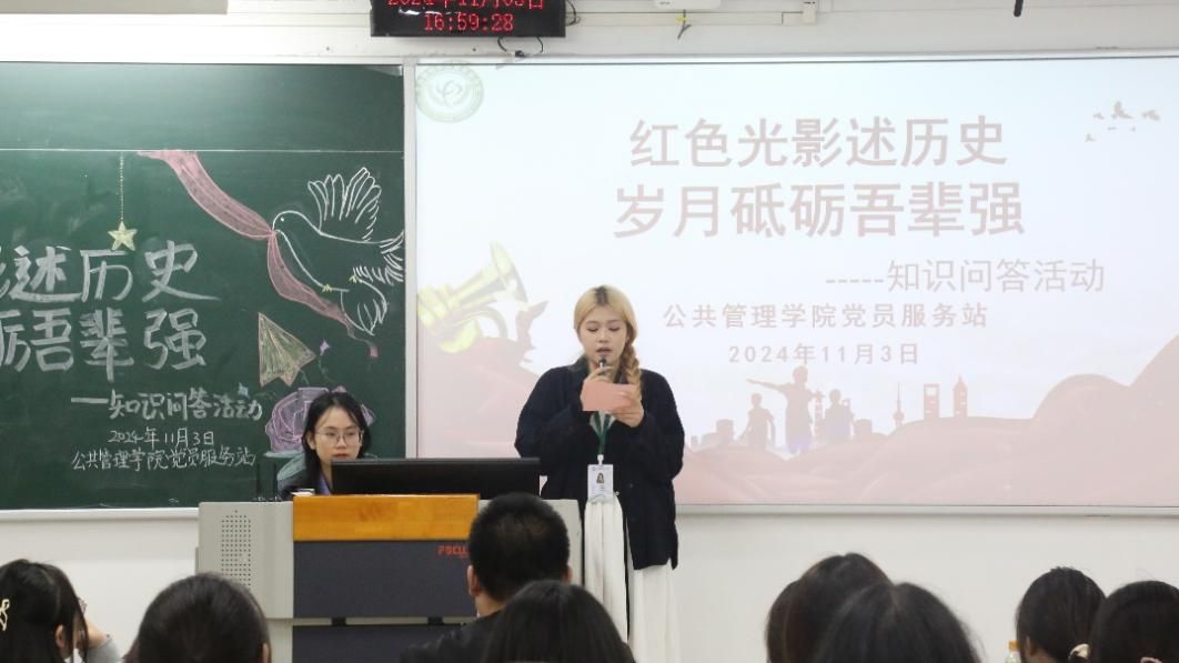当前位置: 首页 >> 社区建设 >> 党员服务站 >> 正文 红色光影述历史,岁月砥砺吾辈强——公共管理学院党员服务站举办知识问答活动 时间:2024年11月06日 15:30 作者: 公共管理学院党员服务站 为深入学习党的光辉历程,弘扬党的优良传统,增强青年一代的历史责任感和使命感,深切感受革命先辈们坚定的理想信念和不屈不挠的斗争精神,2024年11月3日17:00,公共管理学院党员服务站在博智楼07304成功举办了“红色光影述历史,岁月砥砺吾辈强”知识问答活动,党员服务站人员和活动参与者共计70余人参与此次活动。 “红色记忆 党史知识问答”环节,大家共同观看了一段关于中国共产党百年历史的短片,回顾党的伟大历程和取得的辉煌成就,并在视频结束后进行互动问答环节,加深同学们对党史的了解和感悟。 “红色记忆 猜重大事件”环节 ,同学们通过视频片段,来推测中华人民共和国成立以来的历史大事件。大家纷纷举手抢答,释放着青年一代的朝气。这一环节在巩固党史知识的同时,也提高了活动的趣味性。 “红色记忆 历史旋律回响”环节。伴随着熟悉的红歌旋律,同学们纷纷踊跃抢答,活动现场充满欢乐的气氛。通过这一环节不仅让人们重温了革命先辈们的热血岁月和光辉历史,还在激昂的旋律与动人的歌词中传承了红色基因。 此次“红色光影述历史,岁月砥砺吾辈强”知识问答活动不仅使活动的参与者们更深刻地感受党史,增强了责任感和信念感,还激发了大家的爱国热情和奋斗精神。相信同学们在今后的日常生活中,能够将其内化于心,外化于行,成为有理想、有担当、有作为的新时代青年! 上一条:文学与新闻学院党员服务站举办“拾叶行动,共筑绿梦”秋叶创作劳动教育实践活动 下一条:经济学院党员服务站举办“从战火中走来,向辉煌处进发”——承抗美援朝精神,促国家发展兴盛主题活动 【关闭】